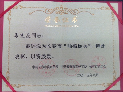 近日,长春市委宣传部、市高校工委、市总工会等7家单位联合下发《关于表彰长春市教科文卫体系统职业道德标兵的决定》。经基层推荐、组织把关、严格考核和社会公示,共评选表彰师德标兵59名。我校马光焱获长春市“师德标兵”荣誉称号。