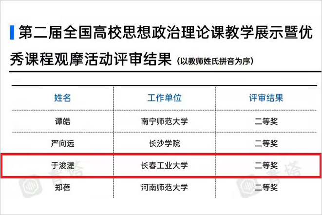 全国高校思想政治理论课教学展示暨优秀课程观摩活动是全国高校思想政治理论课教学比赛中主办规格最高、参赛课程最全、选手水平最强的一项活动。本次评选活动,吉林省共推荐17位教师参赛。于浚湜以2021年吉林省高校思政课“精彩一课”大赛一等奖的成绩入围全国大赛,并最终在历时近半年的层层选拔中获得二等奖。