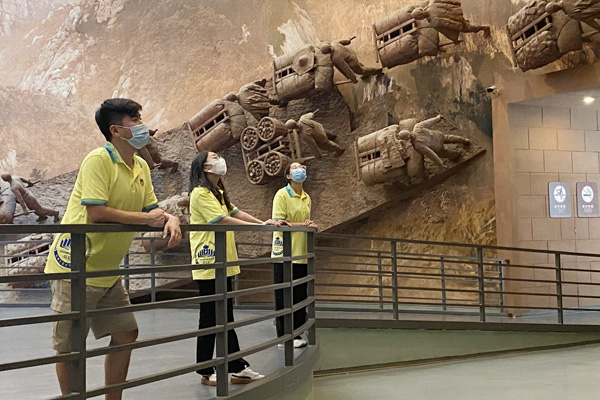 在党的群众路线教育主题展览馆,颇为引人注目的是一组名为《力量》的巨幅群雕:一辆辆小推车装满支援前线的物资,艰难行进在山水间,小车后是一个个目光坚毅、勇往直前的沂蒙老百姓,沿着曲折蜿蜒的道路盘旋而上。令人震撼的雕塑作品,仿佛带大家穿越时空,走进那段艰苦卓绝的战争岁月,感受到共产党人为了人民幸福,为了民族解放与复兴,抛头颅、洒热血,不怕牺牲,吃苦在前、享受在后,勇于进取,开拓创新,带领着人民开辟了一片崭新的天地。