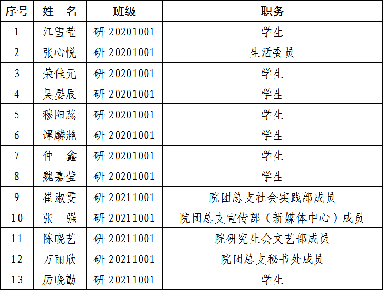 为了认真贯彻党的发展党员工作方针,充分发扬民主,增加发展党员工作的透明度,把好发展党员质量关,确保新党员质量,现将经本学院党委预审,拟接收的中共预备党员在全院范围内公示。公示时间为5天(2022年11月9日至2022年11月15日)。在公示期内,党内外群众如对拟接收的中共预备党员有意见,请以真实单位、姓名,用书面、电话等形式如实反映情况。群众反映的问题可受到法律保护,我们将严格保密。