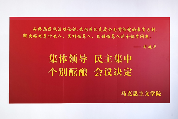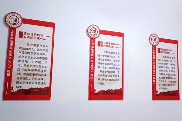 文化墙以学院现有办公教学场所、党员活动室和会议室为主要区域,内容涵盖了习近平总书记对思政课教师的殷殷嘱托和谆谆教诲、学院简介、教师宣誓、风采展示等主题,形式简洁大气,布局庄重大方,充分体现了时代赋予高校h动漫