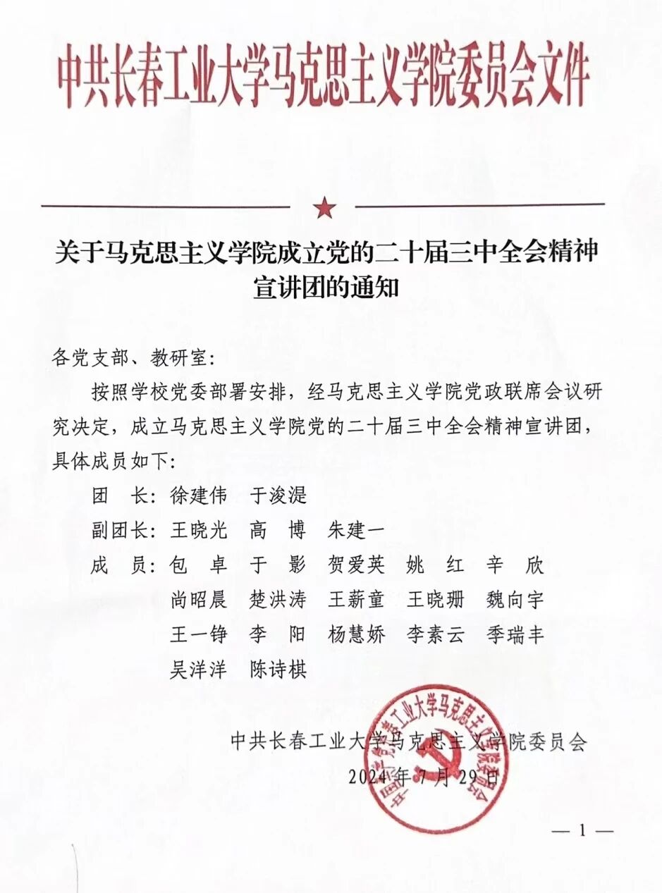 7月29日,学院第一时间成立了由学院党委书记、院长任组长,副院长、副书记任副组长,党支部书记、教研室主任和骨干教师为主要成员的“学习贯彻党的二十届三中全会精神宣讲团”。宣讲团将主要围绕深入学习领会习近平总书记在全会上的重要讲话精神,全面准确理解《中共中央关于进一步全面深化改革 推进中国式现代化的决定》提出的进一步全面深化改革重大举措等内容进行深入系统解读,并以系列思政微课形式引领师生共同掌握全会精神蕴含的道理学理哲理。