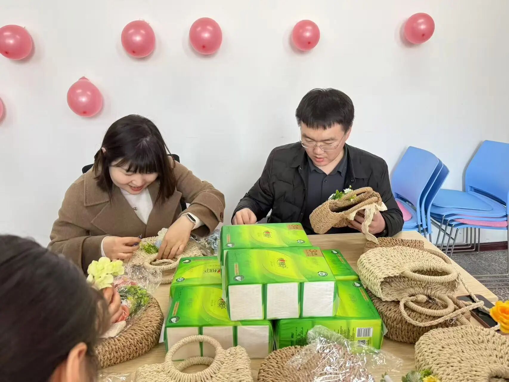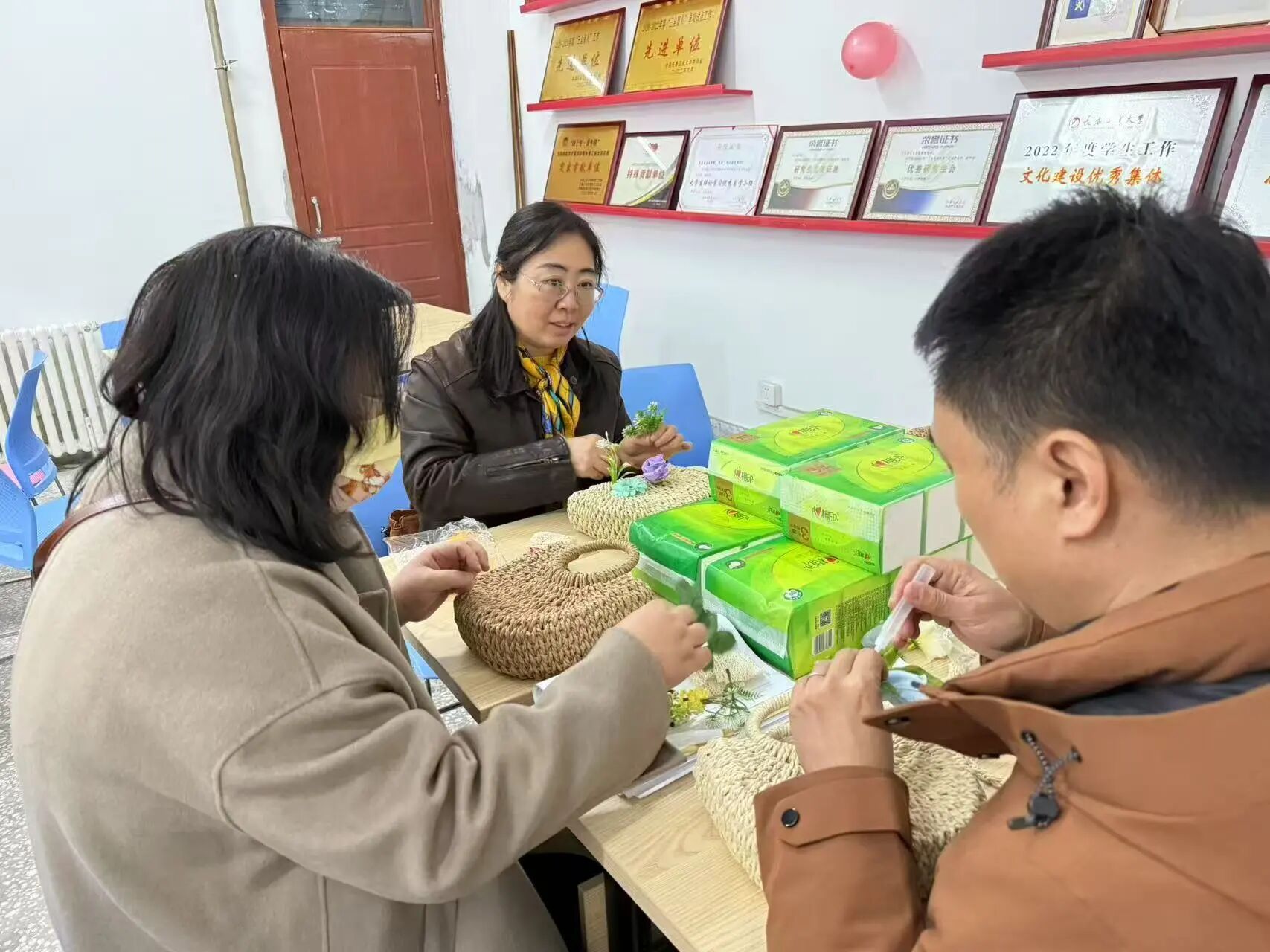 在学院会议室开展“包揽春日,魅力巾帼”手工草编包DIY活动,全院女性教职工齐聚一堂,共度温馨且意义非凡的节日。